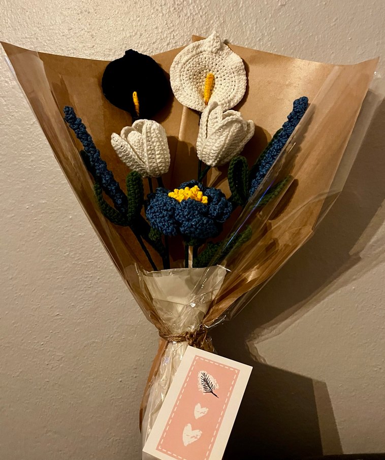 Bohem tarzda, beyaz, mavi ve siyah tonlarında el örgüsü çiçeklerden oluşan buket, şeffaf kahverengi kağıda sarılıdır. İateğe göre sipariş yapılır