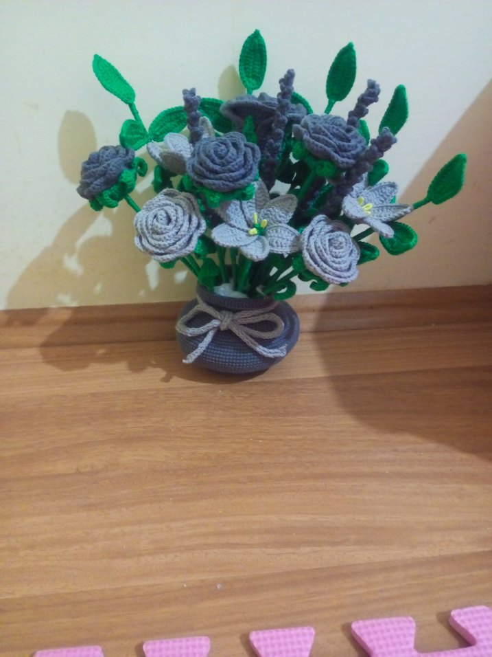 Sipariş üzerine örülür. Koton iplikle yapılmış, çeşitli çiçek şekilleri ve yeşil yapraklar içeren el örgüsü bohem tarzı çiçek buketi.