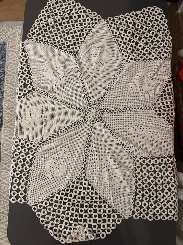 Bu bohem tarzı el örgüsü masa örtüsü, çiçek desenli ve dairesel detaylı karmaşık tığ işiyle yapılmıştır.