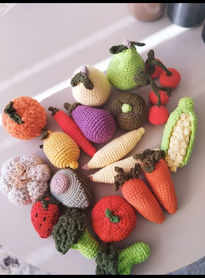 Yumuşak iplikten yapılmış bohem tarzı el örgüsü renkli sebzeler, havuç, mısır ve domates gibi çeşitli şekiller içerir.