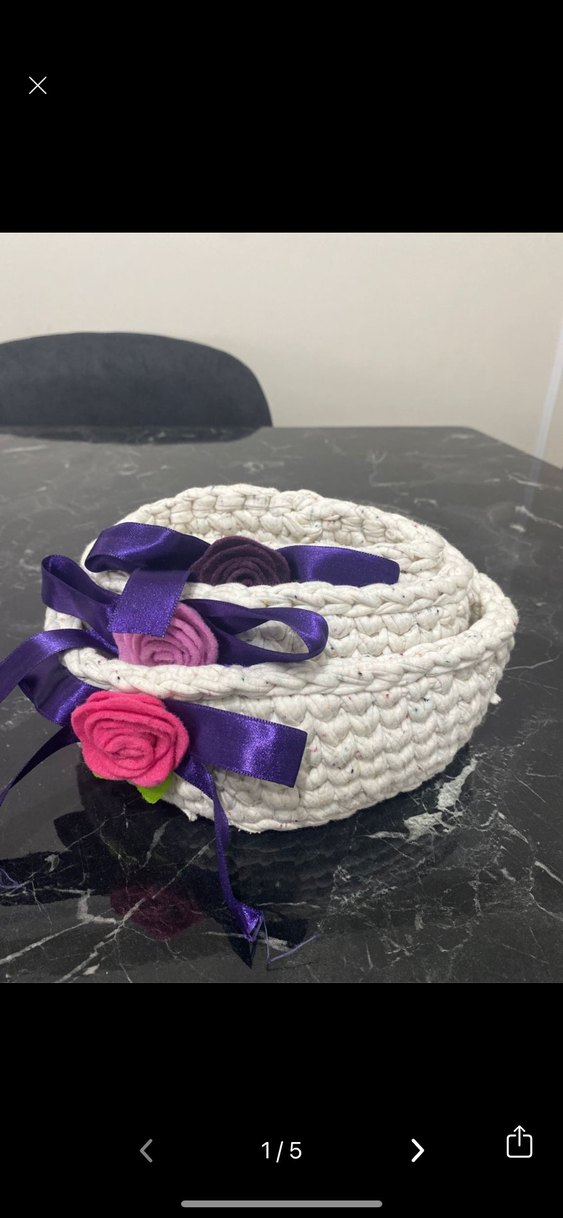 Kalın doğal iplikle el örgüsü yapılmış, mor kurdele ve pembe kumaş çiçeklerle süslenmiş bohem tarzı sepet.