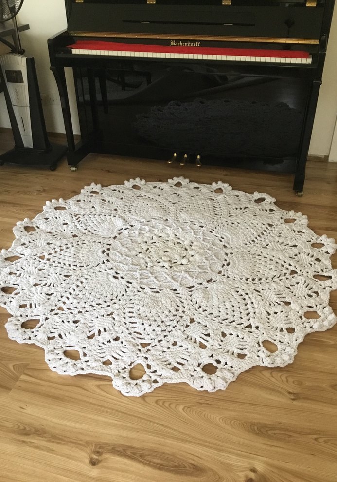 Yumuşak doğal renkte, el örgüsü yuvarlak halı, karmaşık bohem desenle zeminlere doku katıyor. Çap 1 metre 60 cm ;4mm kalınlığında kalın makrome ipiyle yapıldı %100 koton iple yapıldı