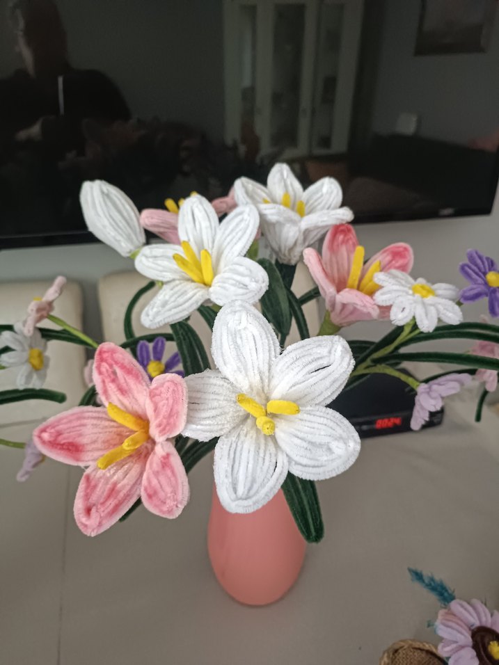 Bohem tarzda, pembe, beyaz ve mor renklerde, sarı detaylı el yapımı çiçek aranjmanı. Dokulu yapraklar ve yeşil saplarla doğal bir görünüm sağlar.