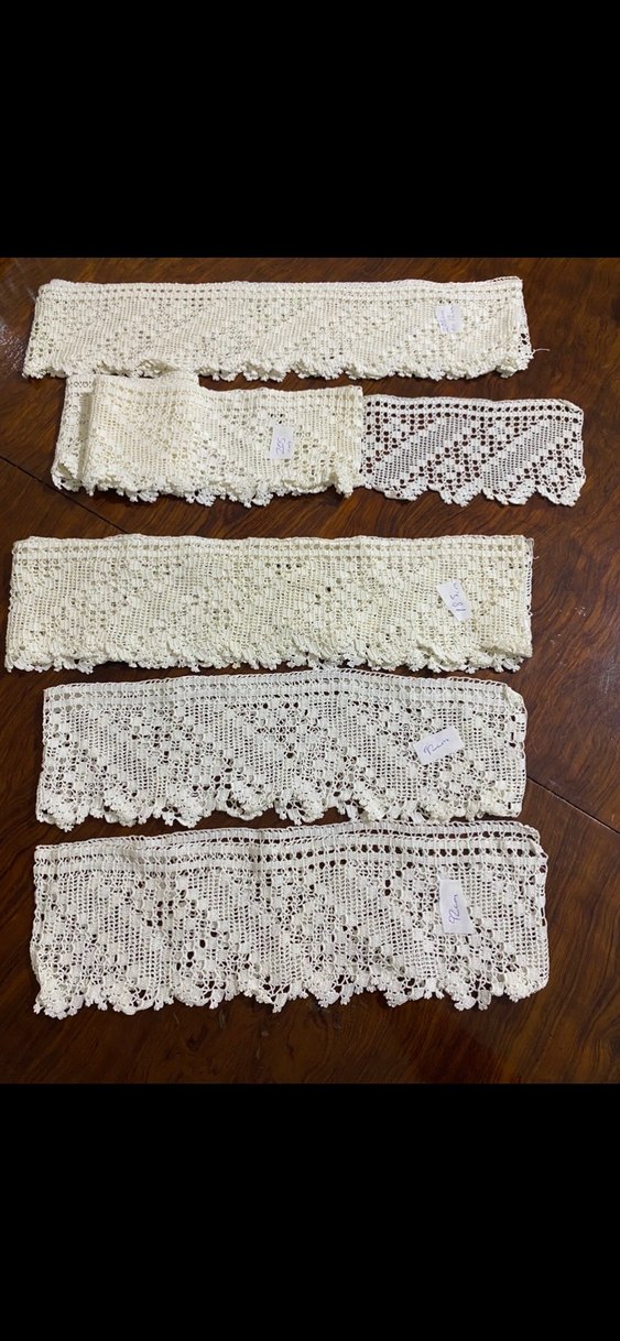 Bohem tarzında, doğal krem renginde el yapımı dantel şeritler. İnce tığ işi desenlerle süslenmiştir. Tekstil ve el işleri için uygundur.