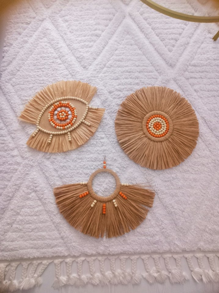 Doğal lifler ve turuncu-bej boncuklarla el yapımı bohem tarzı dekoratif süsler, iç mekanlara rustik bir hava katar.