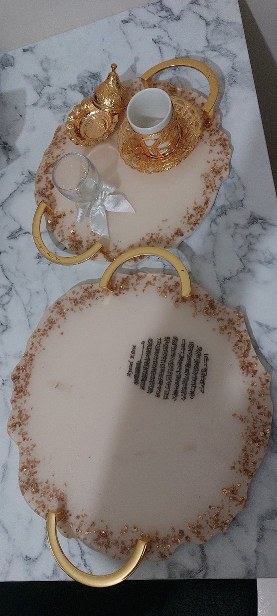 Altın yaldızlı kenarları ve kavisli sapı olan el yapımı bohem tarzı dekoratif tepsi. ✨