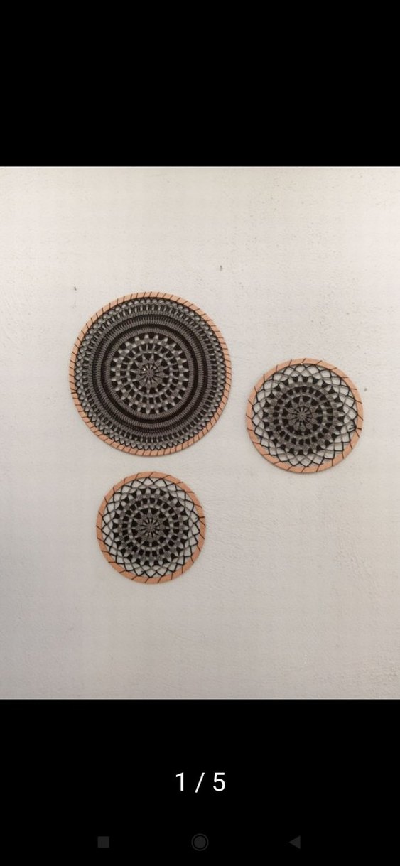 Bohem tarzı, nötr tonlarda karmaşık dairesel desenlere sahip üçlü el yapımı duvar süsü seti. Her odaya özgün bir dokunuş katar.