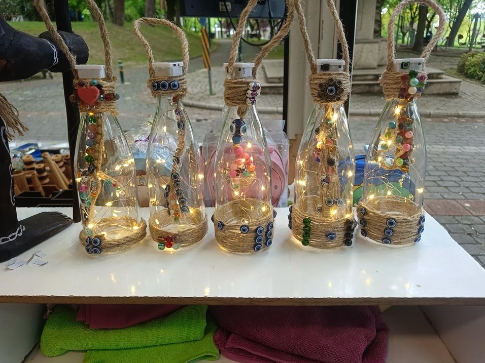Boncuk ve iplerle süslenmiş, içinde sıcak LED ışıklar bulunan bohem tarzı el yapımı cam şişeler. Ortam dekorasyonu için uygun.