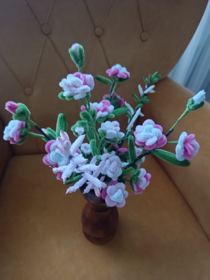 Bohem tarzda, pembe ve beyaz keçe çiçekler ile yeşil yapraklardan oluşan el yapımı çiçek aranjmanı, kahverengi vazoda.