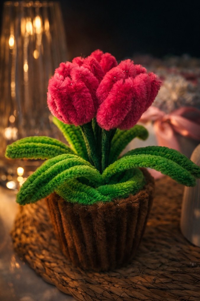 Yumuşak kırmızı çiçekler ve yeşil yapraklarla el yapımı, dokulu malzemeden bohem tarzda dekoratif saksı. El yapımı saksılı çiçek Buket’i Solmayan dökülmeyen İstenilen tarzda çalışılır
