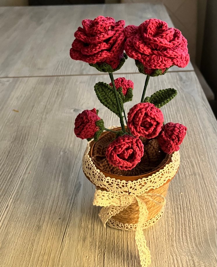 Dantel süslemeli saksıda el yapımı, kırmızı renkli örgü güller ve yeşil yapraklar, bohem tarz dekor için uygun .