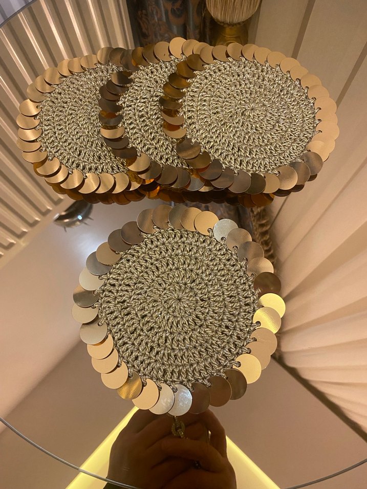 Örgü dokulu ve parlak payet kenarlı bohem tarzda el yapımı bardak altlıkları, masanıza dekoratif bir dokunuş katar. ✨6 adet 31 adet pullu