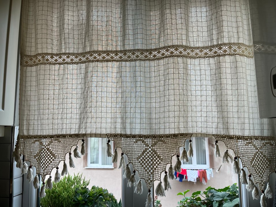 Bohem tarzı, ızgara desenli ve püsküllü el yapımı tül perde, detaylı tığ işi süslemelerle tamamlanmıştır. 120/120