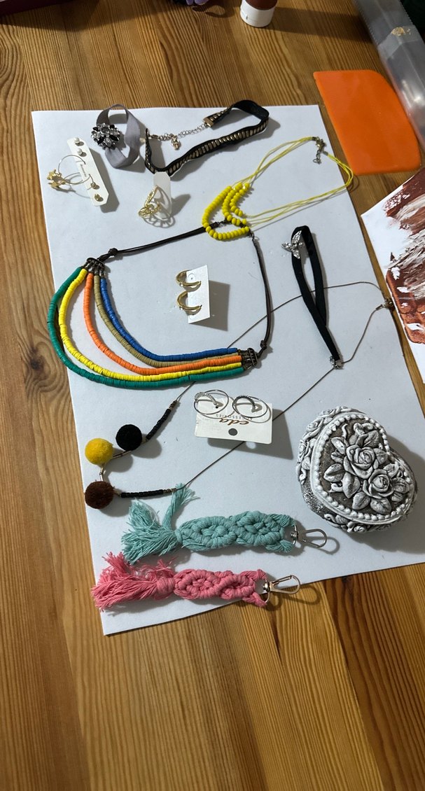 Bohem tarzı, yumuşak dokulu, renkli boncuklar ve ponponlar içeren el yapımı kolyeler, küpeler ve örgülü anahtarlıklardan oluşan set. Bunları kullanmadım