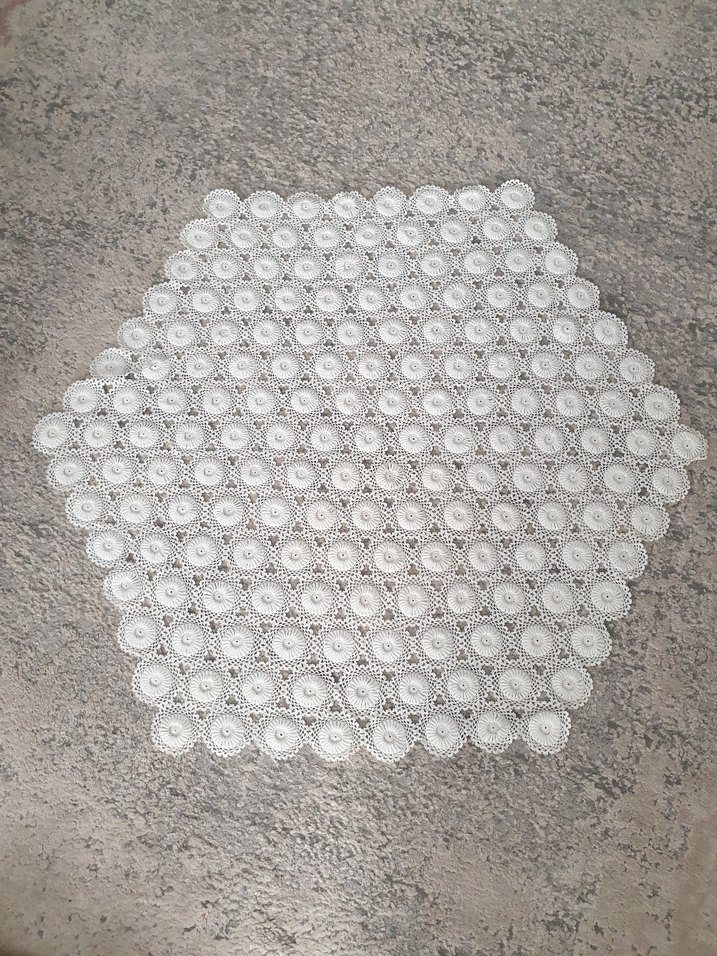 Bohem tarzda, el yapımı yuvarlak dantel örtü, ince dairesel desenlerle süslenmiştir, mekanınıza zarif bir dokunuş katar.