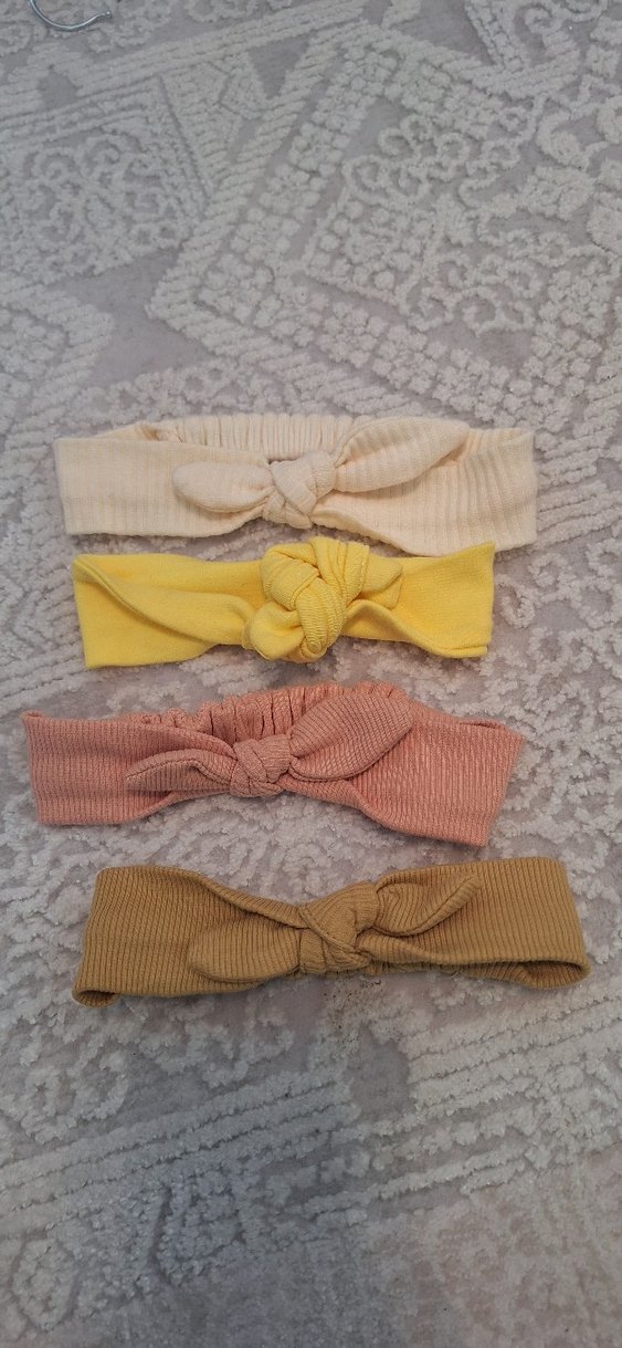 Pastel bej, sarı, pembe ve kahverengi bohem tarzı düğümlü elastik çocuk saç bantları seti. Yumuşak ve rahat, günlük kullanım için uygun. krem rengi haric hicbiri kullanilmadi