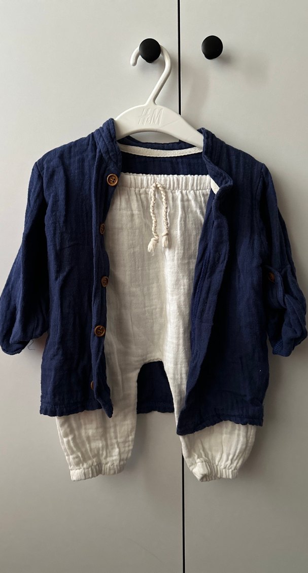 Bohem tarzında, düğmeli lacivert uzun kollu üst ve lastikli beyaz keten pantolon içeren bebek takımı. 9/12 aylıktır