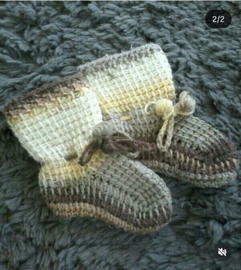 Bej ve gri tonlarda, örgü kumaştan yapılmış bohem tarzı erkek bebek patikleri. Düz ve sade tasarıma sahiptir.