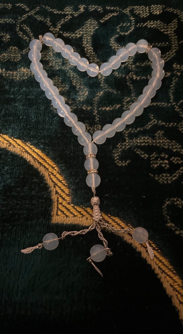 Hafif beyaz renkte, yuvarlak boncuklardan oluşan ve dekoratif püsküllerle tamamlanan bohem tarzı erkek tesbihi. ✨