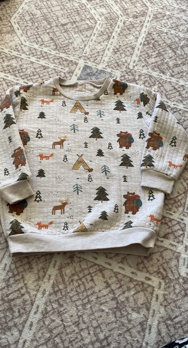 Bohem tarzı erkek çocuk sweatshirtü, bol kesim, uzun kollu ve bisiklet yaka olarak tasarlanmıştır. Yumuşak ve sıcak kumaştan, örme dokuda olup, orman temalı baskılar içerir.