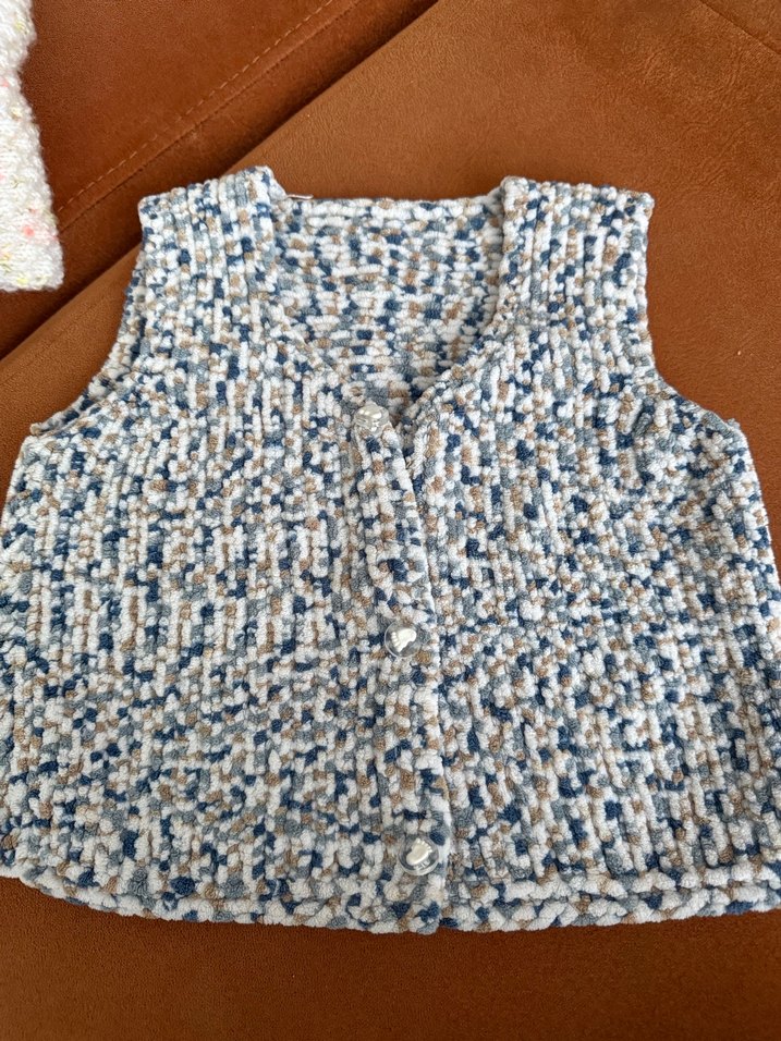 Bohem tarzı, bej ve gri renklerde, kollu olmayan, yakalı ve bol kesim örgü erkek çocuk yeleği.