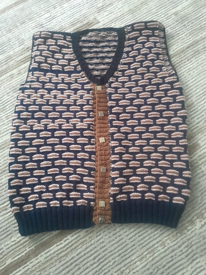 Fitted kesim, V yakalı, örme ve kolsuz erkek yeleği. Parlak kahverengi tonlarda bohem tarzı desen ve düğme detaylarına sahiptir. 2 koltuk arası 57 boy 72