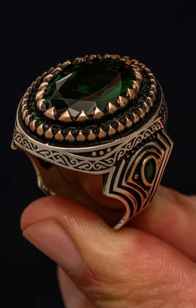 Bohem tarzı erkek yüzüğü, koyu turkuaz taş ve detaylı vintage desenli bant ile retro bir görünüm sunar.