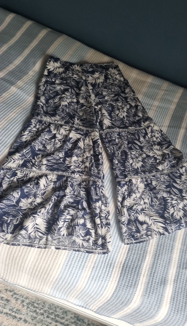Mavi-gri bağlama desenli, bol kesim ve pileli uzun cocuk pantolonu. Sentetik kumaştan, bohem tarzını yansıtır.