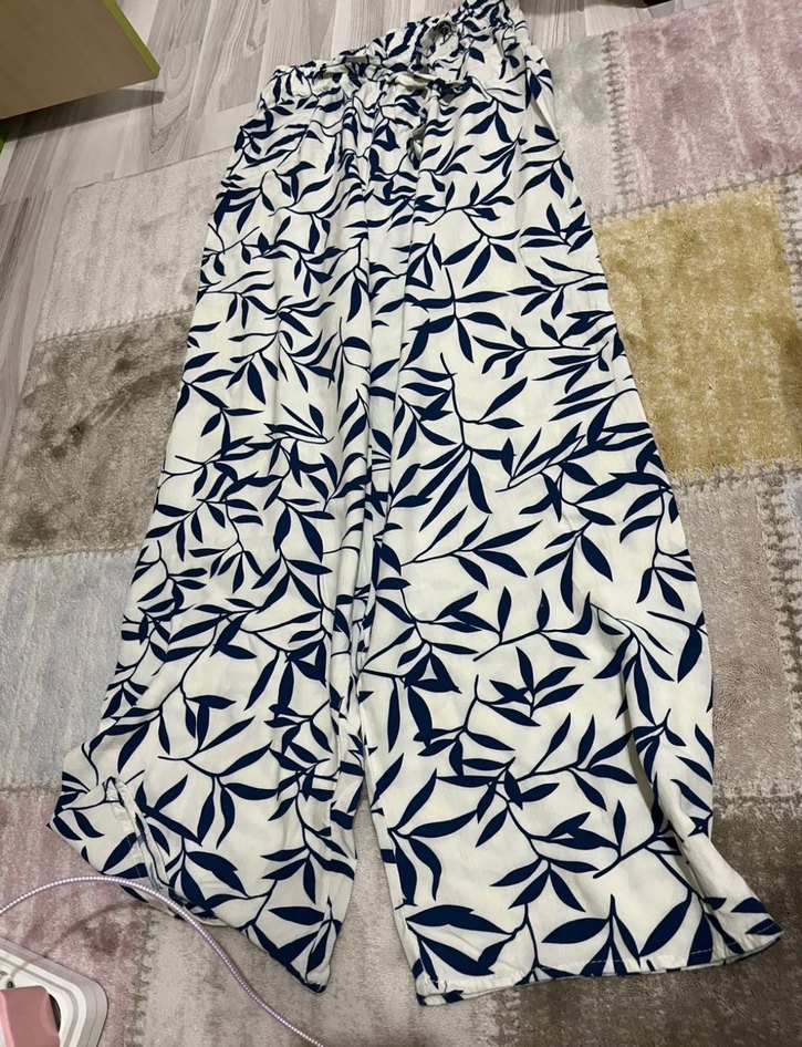 Bohem tarzı, geniş kesim ve dökümlü yapıya sahip, yaprak desenli gri-beyaz kadın pantolonu. Yumuşak sentetik kumaştan, rahat kullanım için uygun.