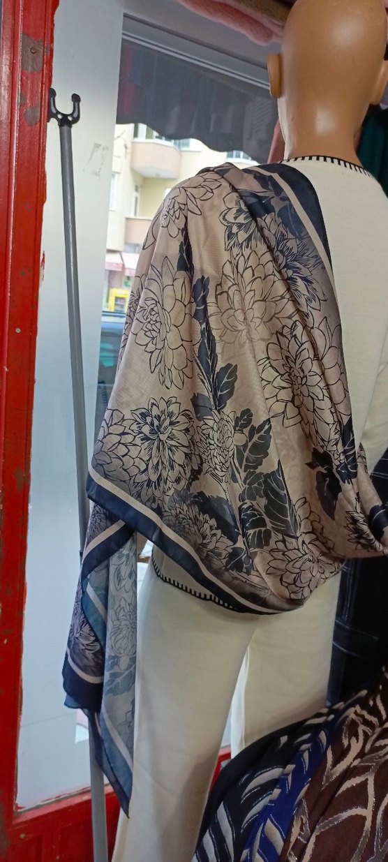 İpek dokulu, gri ve bej çiçek desenli, bohem ve retro tarzına uygun drapeli kadın fular.