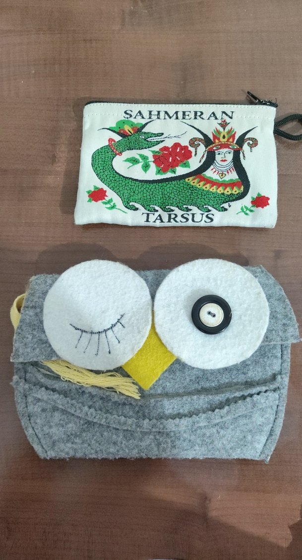 Gri keçe malzemeden yapılmış baykuş desenli çocuk cüzdanı ile 'TARSUS' ve 'SAHMERA' yazılı renkli baskılı fermuarlı çanta seti.