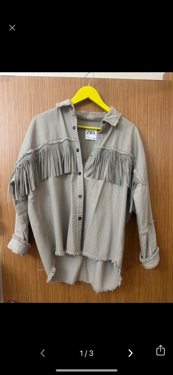 Bohem tarzı, düğmeli ve uzun kollu kadın kot ceket. Bej-gri tonlarında keten kumaştan, gevşek kesim ve püskül detaylı, günlük kullanıma uygun.
