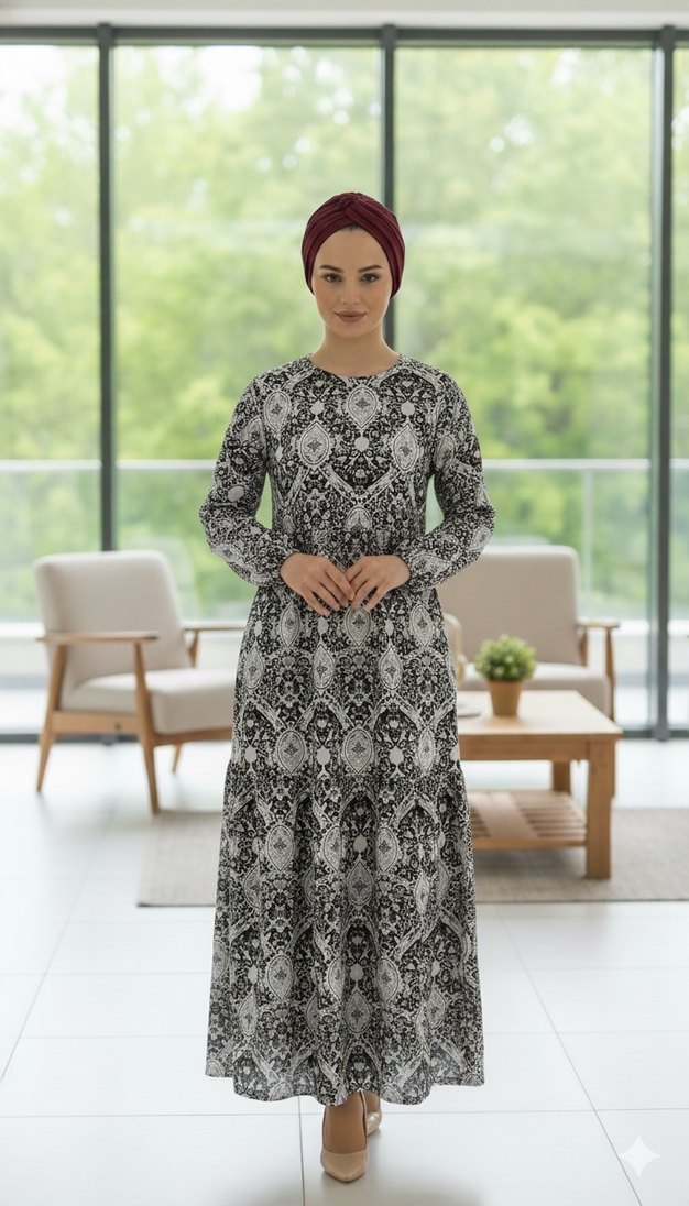 Gri tie-dye desenli, bol kesim uzun kollu elbise, drapeli detaylı ve yuvarlak yakalı, yumuşak sentetik kumaştan günlük kullanım için.
