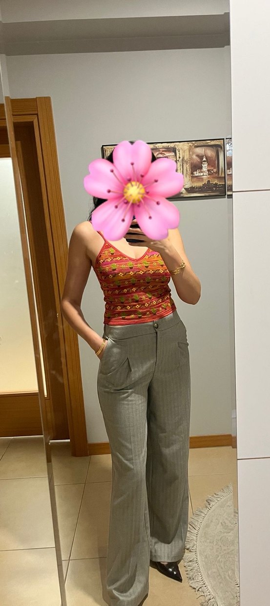 İnce askılı, vücuda oturan kadın üstü, pembe tonlarında canlı batik desenli ve dantel detaylıdır. Bohem ve retro tarzda, günlük kullanım için uygundur.