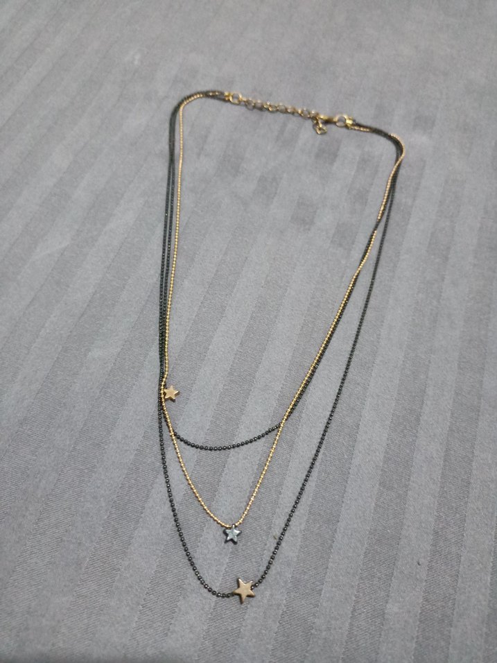 Bohem tarzı, işlemeli yıldız desenli altın ve gri tonlarında katmanlı zincir detaylı kadın kolye, günlük kullanım için uygun. ✨
