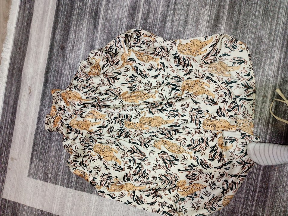 Bohem tarzı kadın gömlek , gri ve kahverengi tonlarda, dökümlü tasarıma sahip. Sentetik kumaştan yapılmıştır.
