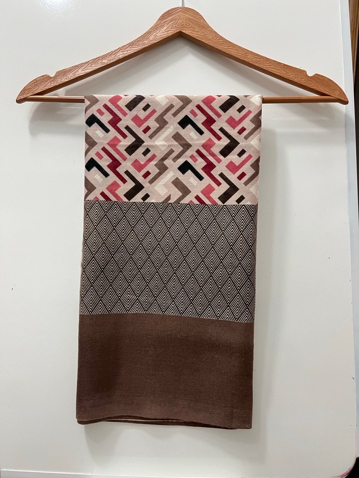 Kadınlar için kahverengi ve gri tonlarda, çağdaş desenli ve drapeli şal. Bohem ve retro tarzlarıyla uyumlu, rahat bir görünüm sunar.