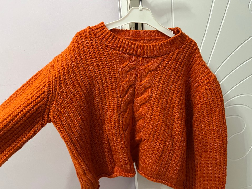 Kadınlar için bohem tarzda, parlak turuncu örgü kazak. Salaş kesim, uzun kollu ve yuvarlak yaka. Normal midi boyda, günlük kullanıma uygun rahat model.