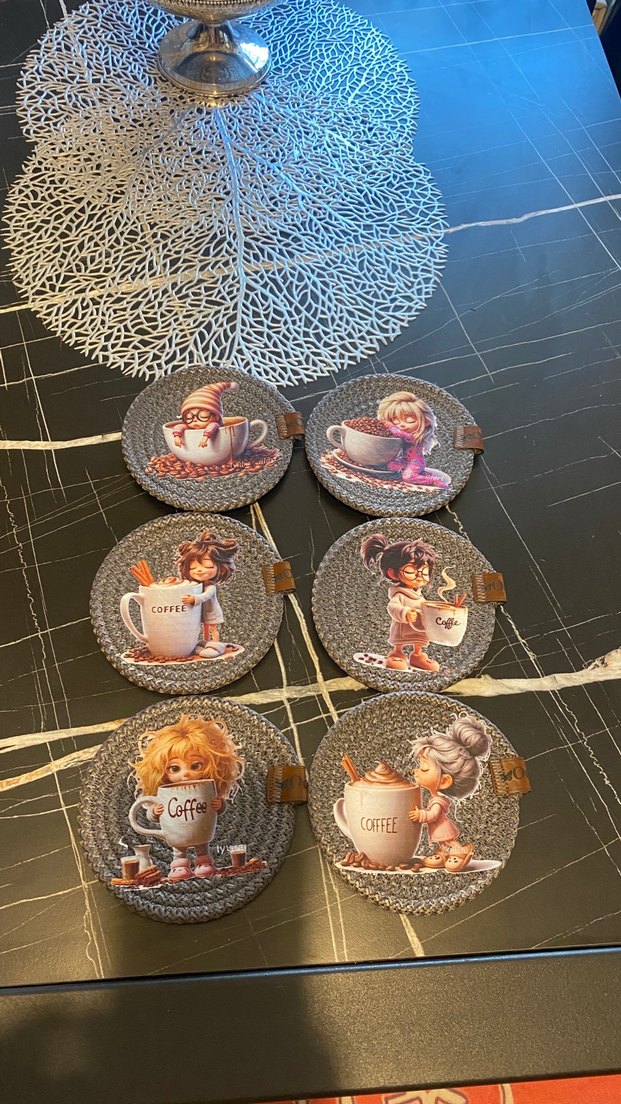 Bohem tarzda, kahve temalı sevimli figürlerin yer aldığı el yapımı bardak altlıkları. Her biri farklı karakterlerle masanıza şıklık katıyor. ☕ adet fiyatı büyük sunumluk için
