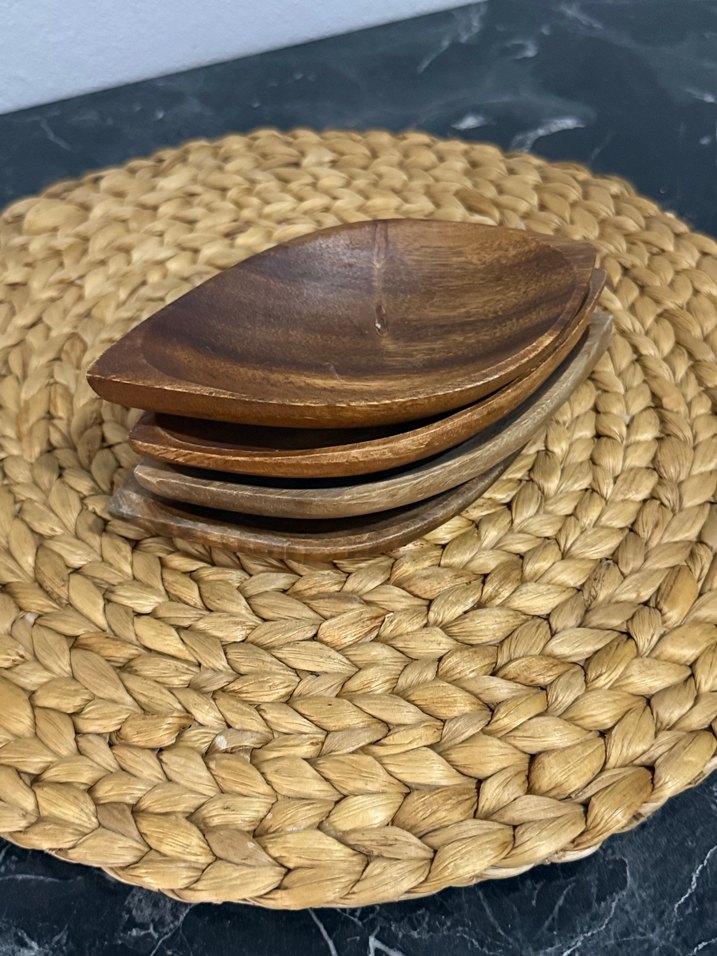 Bohem tarzda, kahverengi ve desensiz ahşap tabak seti. Rustik masa düzenleri için uygun. ️