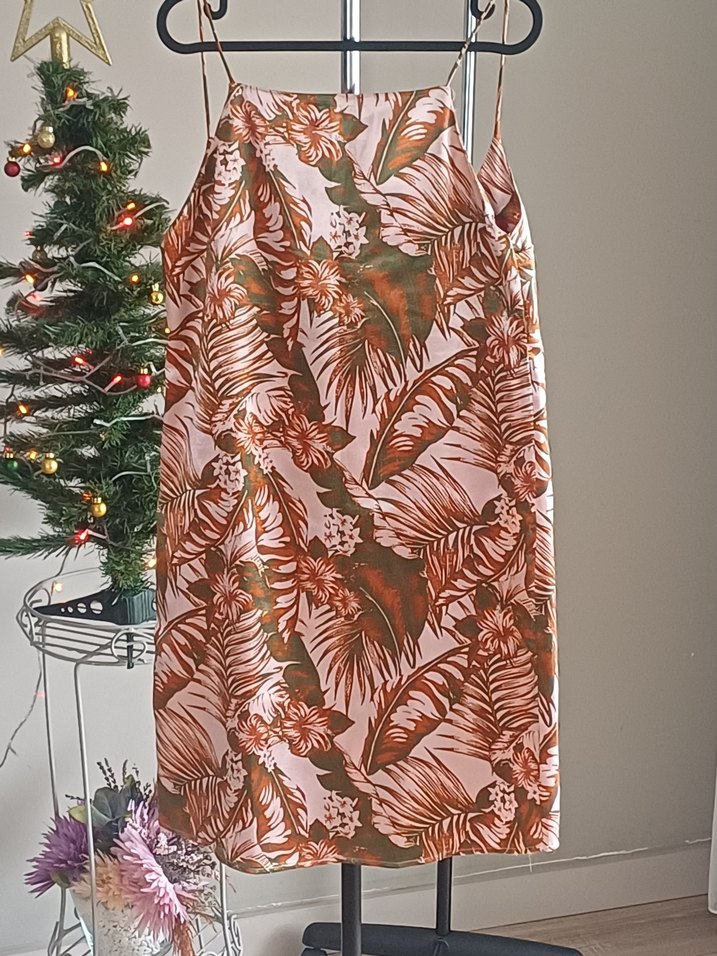 Bohem tarzı, askısız, gevşek kesim kahverengi çiçek desenli sentetik kumaştan midi boy elbise Drapeli tasarıma sahiptir, günlük kullanım için uygundur.