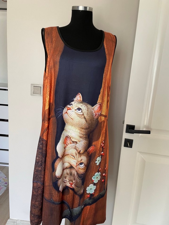 Bohem tarzda, kahverengi baskılı, drapeli kedi desenli kolsuz elbise. Rahat ve şık tasarım.