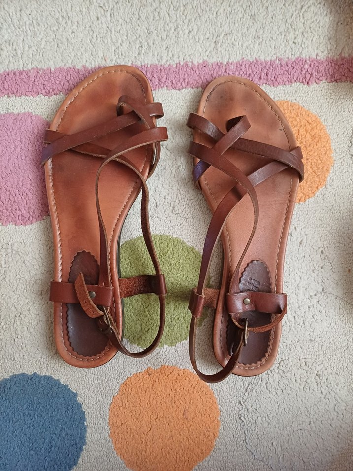 Kahverengi deri, tokalı bantlara sahip kadın sandaletleri, bohem tarzıyla günlük kullanıma uygun.