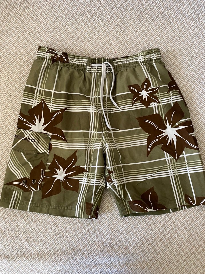 Kahverengi çiçekli ve çizgili desenli, bel kemerli, bol kesim erkek yüzme şortu. Retro ve bohem tarzıyla plaj için uygun.
