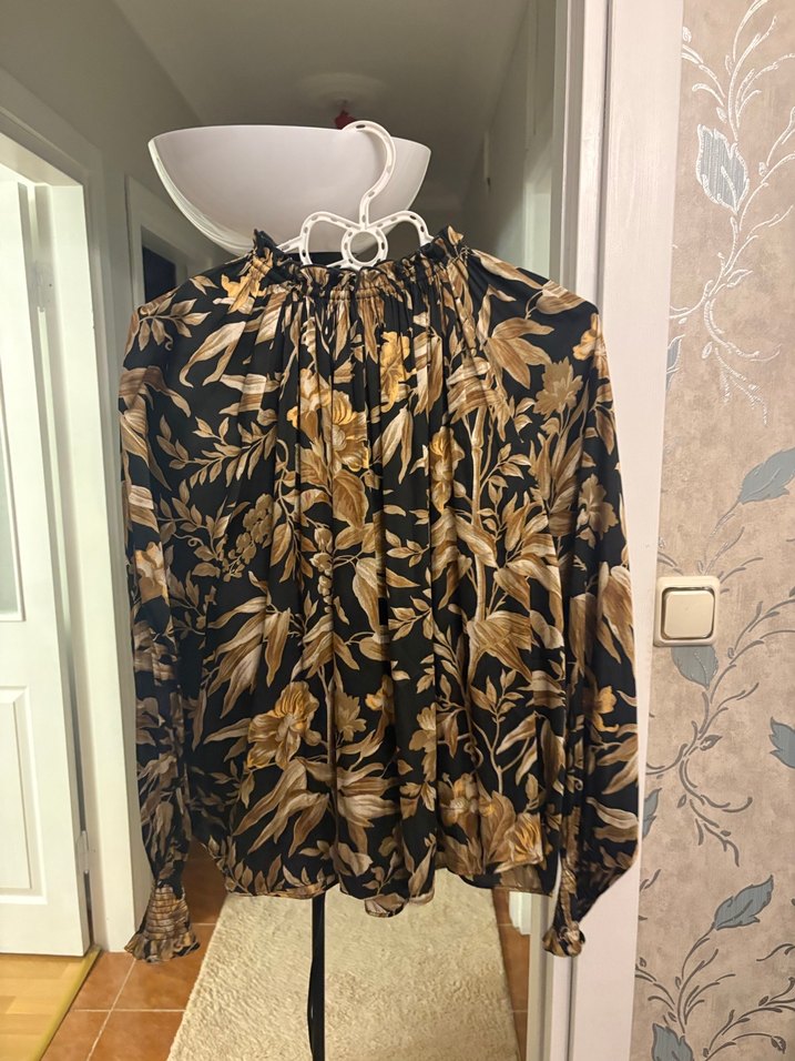 Bohem tarzı, bol kesim, yüksek yakalı ve uzun kollu, kahverengi desenli ipeksi kumaştan günlük kullanıma uygun kadın bluz.