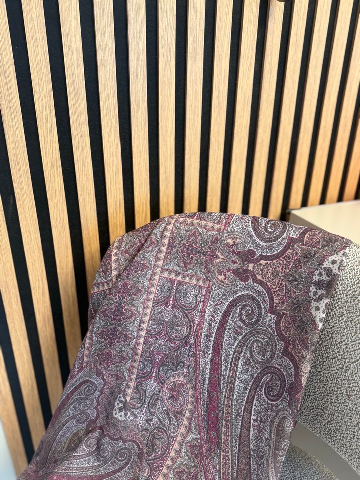 Yumuşak tekstilden yapılmış, kahverengi paisley desenli ve drapeli kadın şalı, bohem ve retro tarzını yansıtıyor.