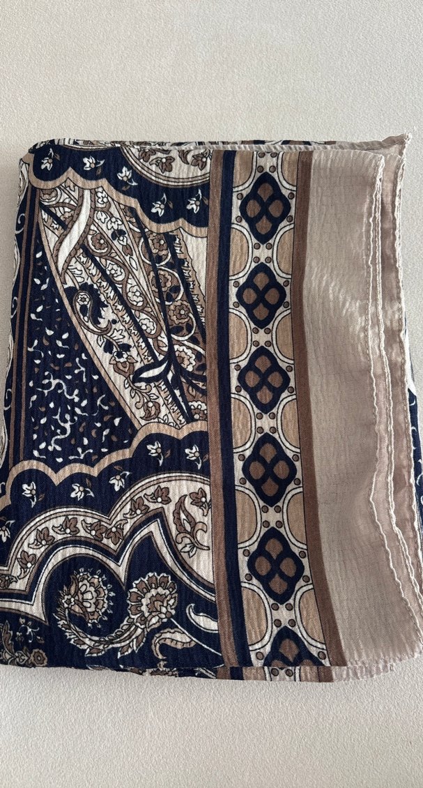 Koyu kahverengi, desenli ve dokuma kumaştan yapılan bu kadın şalı, bohem, retro ve hippie tarzlarını yansıtır. Yumuşak ve dökümlü yapıya sahiptir.