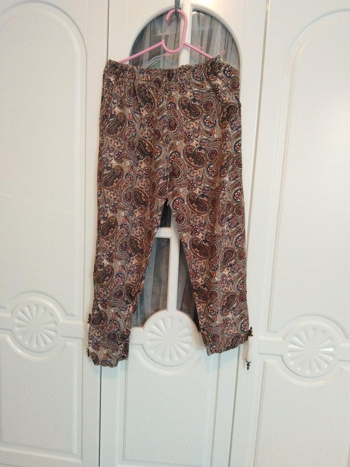 Bohem tarzı, kahverengi tie-dye desenli, bol kesim ve tokalı detaylı kumaş pantolon. Midi boy ve rahat sentetik kumaştan, günlük kullanıma uygun.