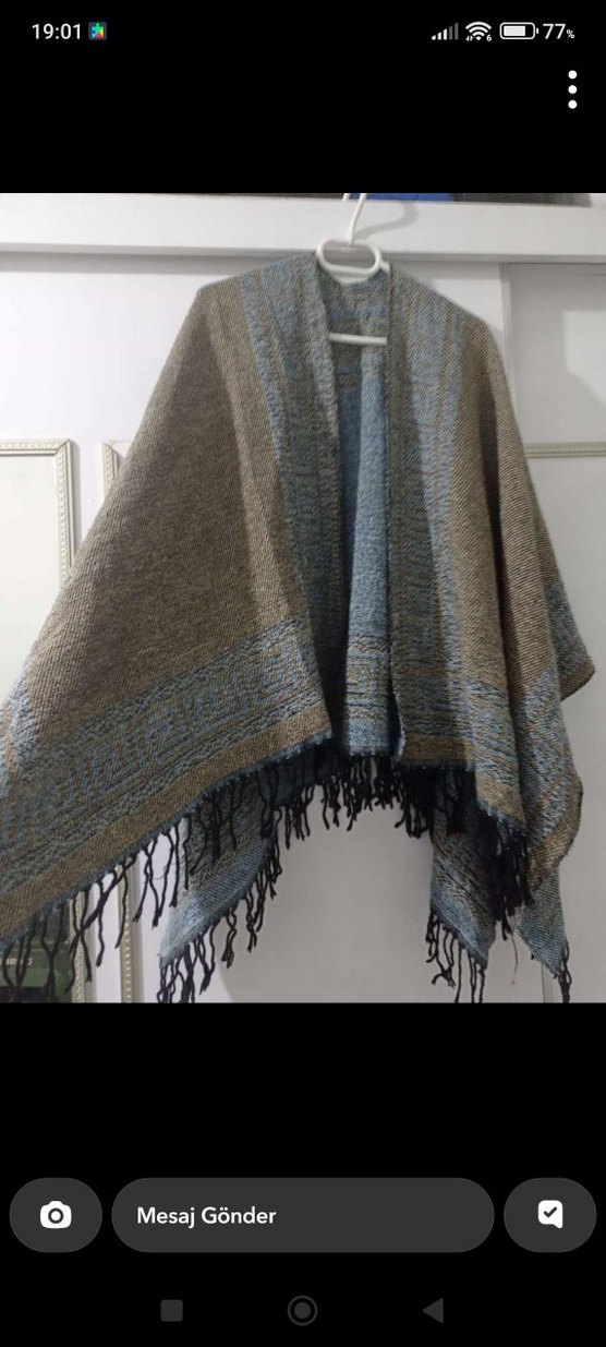 Kadın pelerin, yumuşak yünden, kahverengi ve gri tonlarda, bol kesim ve drapeli tasarıma sahiptir. Rahat ve bohem tarzda.