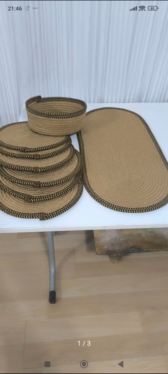 Bohem tarzı kahverengi hasır Amerikan servis seti, doğal malzemelerden üretilmiş rustik görünümlü.